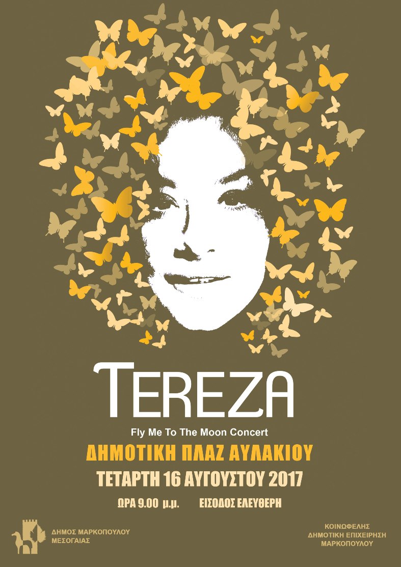Ο Δήμος Μαρκοπούλου και η Κοινωφελής Δημοτική Επιχείρηση (Κ.Δ.Ε.Μ.), σας προσκαλούν στην συναυλία με την εξαιρετική Tereza, την ξεχωριστή performer, με την χαρακτηριστική φωνή και την αξιοσημείωτη ζωντάνια της, στις 16 Αυγούστου 2017 και ώρα 9:00 το βράδυ, στην Πλαζ Αυλακίου στο Πόρτο Ράφτη.