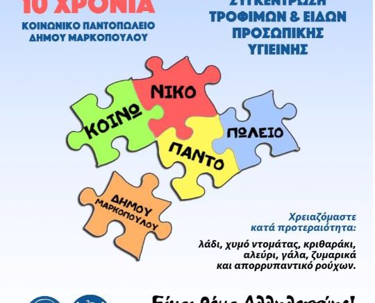 Το Κοινωνικό Παντοπωλείο του Δήμου Μαρκοπούλου, που είναι από τα πρώτα που ιδρύθηκαν και λειτούργησαν στην Αττική, μήνες πριν τις αντίστοιχες κρατικές δομές, συμπληρώνει φέτος μια δεκαετία αδιάλειπτης λειτουργίας και έμπρακτης στήριξης των συμπολιτών μας, που λόγω οικονομικών δυσχερειών, αδυνατούν να καλύψουν βασικές τους ανάγκες.