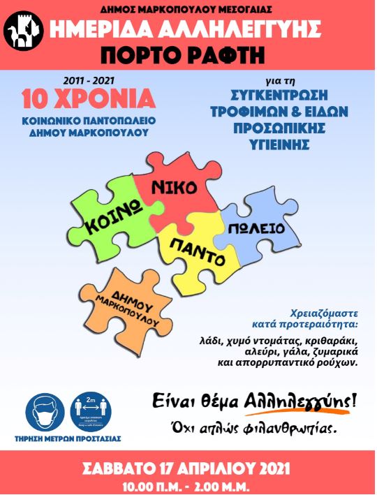 Έπειτα από την άκρως επιτυχημένη διοργάνωση της Διημερίδας Αλληλεγγύης στο Δημαρχείο Μαρκοπούλου, η Κοινωνική Υπηρεσία του Δήμου διοργανώνει αντίστοιχη δράση στο Πόρτο Ράφτη και απευθύνει έκκληση στους συμπολίτες μας, να συνδράμουν με τις προσφορές τους στη συγκέντρωση τροφίμων και ειδών προσωπικής υγιεινής, που θα πραγματοποιηθεί το Σάββατο 17 Απριλίου 2021, από τις 10.00 π.μ. έως τις 2.00 μ.μ. στον εξωτερικό χώρο του Γραφείου Αντιδημαρχίας Παιδείας, Πολιτισμού, Αθλητισμου και Κοινωνικής, για την υποστήριξη των δικαιούχων του Κοινωνικού Παντοπωλείου του Δήμου, που έχουν πραγματική ανάγκη.