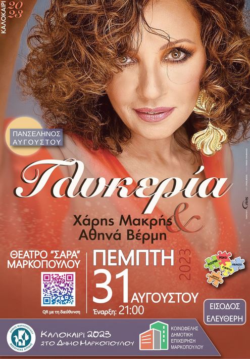 Ο Δήμος Μαρκοπούλου και η Κοινωφελής Δημοτική Επιχείρηση Μαρκοπούλου (Κ.Δ.Ε.Μ.), σας προσκαλούν την Πέμπτη 31 Αυγούστου 2023 και ώρα 21.00, στο Ανοιχτό Θέατρο Σάρα Μαρκοπούλου, να απολαύσουμε όλοι μαζί τη μεγάλη κυρία του ελληνικού πενταγράμμου, Γλυκερία.