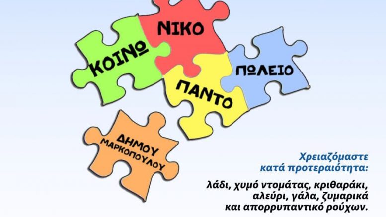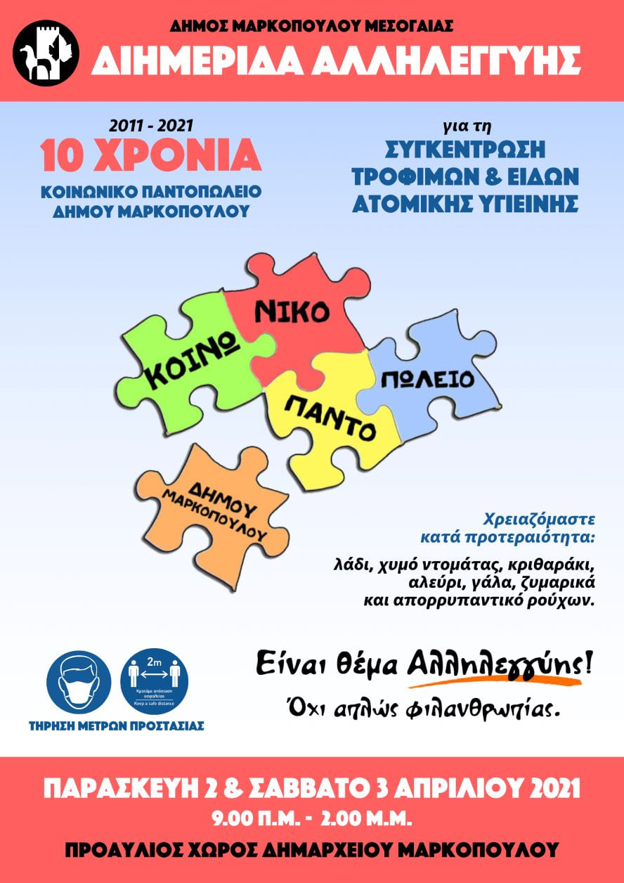 Η Κοινωνική Υπηρεσία του Δήμου Μαρκοπούλου διοργανώνει Διημερίδα Αλληλεγγύης την Παρασκευή 2 και το Σάββατο 3 Απριλίου 2021, από τις 9.00 π.μ. έως τις 2.00 μ.μ. στον προαύλιο χώρο του Δημαρχείου, απευθύνοντας κάλεσμα προσφοράς τροφίμων μακράς διαρκείας, όπως και ειδών ατομικής υγιεινής, για τους συμπολίτες μας που έχουν πραγματική ανάγκη.