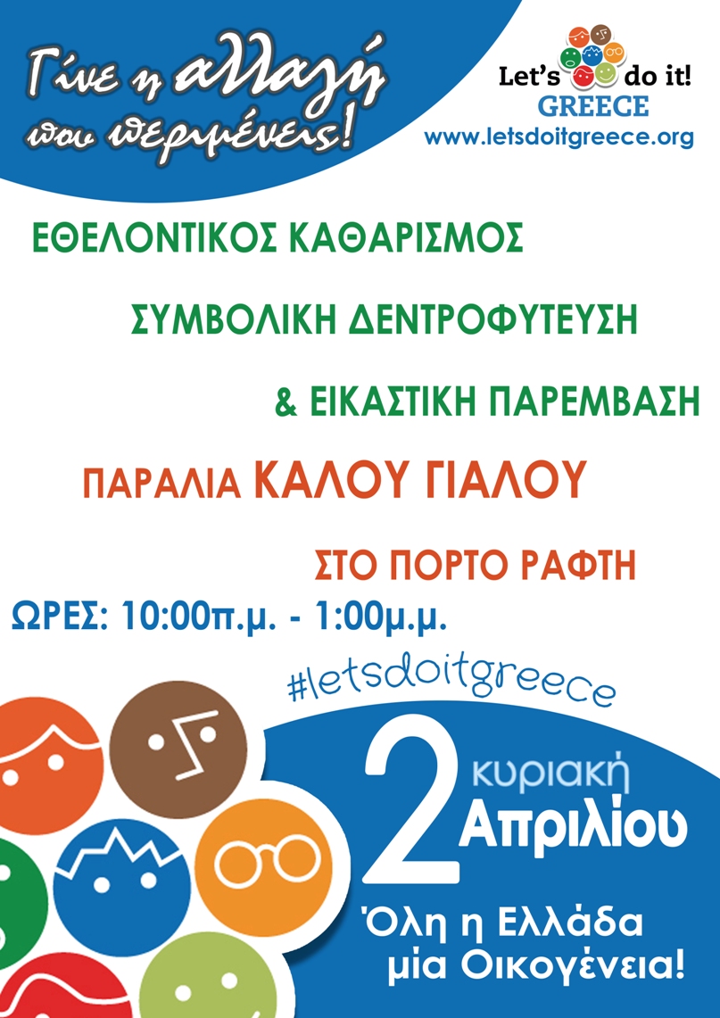 Με στόχο να ομορφύνουμε τον τόπο μας, διαδίδοντας ταυτόχρονα το μήνυμα της συνεργασίας και του εθελοντισμού, σας προσκαλούμε να συμμετάσχετε και φέτος, στην Πανελλήνια Περιβαλλοντική Δράση «Let’s Do It Greece», στην οποία συμμετέχει για 6η συνεχή χρονιά ο Δήμος Μαρκοπούλου. Καθαρίζουμε την παραλία του Καλού Γιαλού, στο Πόρτο Ράφτη, την Κυριακή, 2 Απριλίου 2017 και ώρες 10 το πρωί με 1 το μεσημέρι!
