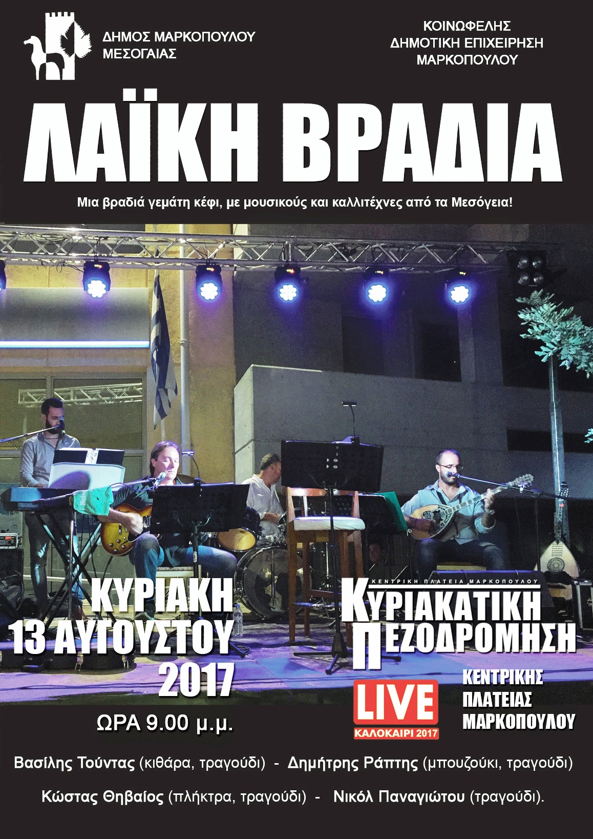 Ο Δήμος Μαρκοπούλου και η Κοινωφελής Δημοτική Επιχείρηση (Κ.Δ.Ε.Μ.), σας προσκαλούν στην Κυριακάτικη Πεζοδρόμηση της Κεντρικής Πλατείας Μαρκοπούλου, στις 13 Αυγούστου 2017 και ώρα 9:00 το βράδυ, με τους: Βασίλη Τούντα (κιθάρα, τραγούδι), Δημήτρη Ράπτη (μπουζούκι, τραγούδι), Κώστα Θηβαίο (πλήκτρα, τραγούδι), Νικόλ Παναγιώτου (τραγούδι), κι άλλους πολλούς, σε αγαπημένα λαϊκά τραγούδια!