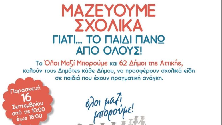 O Δήμος Μαρκοπούλου συμμετέχει και φέτος και σας προσκαλεί στη δράση ευαισθησίας και προσφοράς “Μαζεύουμε Σχολικά γιατί… Το Παιδί Πάνω Από Όλους!” του “Όλοι Μαζί Μπορούμε“, σε συνεργασία με 60 Δήμους της Αττικής, με στόχο τη συγκέντρωση σχολικών ειδών για τα παιδιά που έχουν πραγματική ανάγκη.