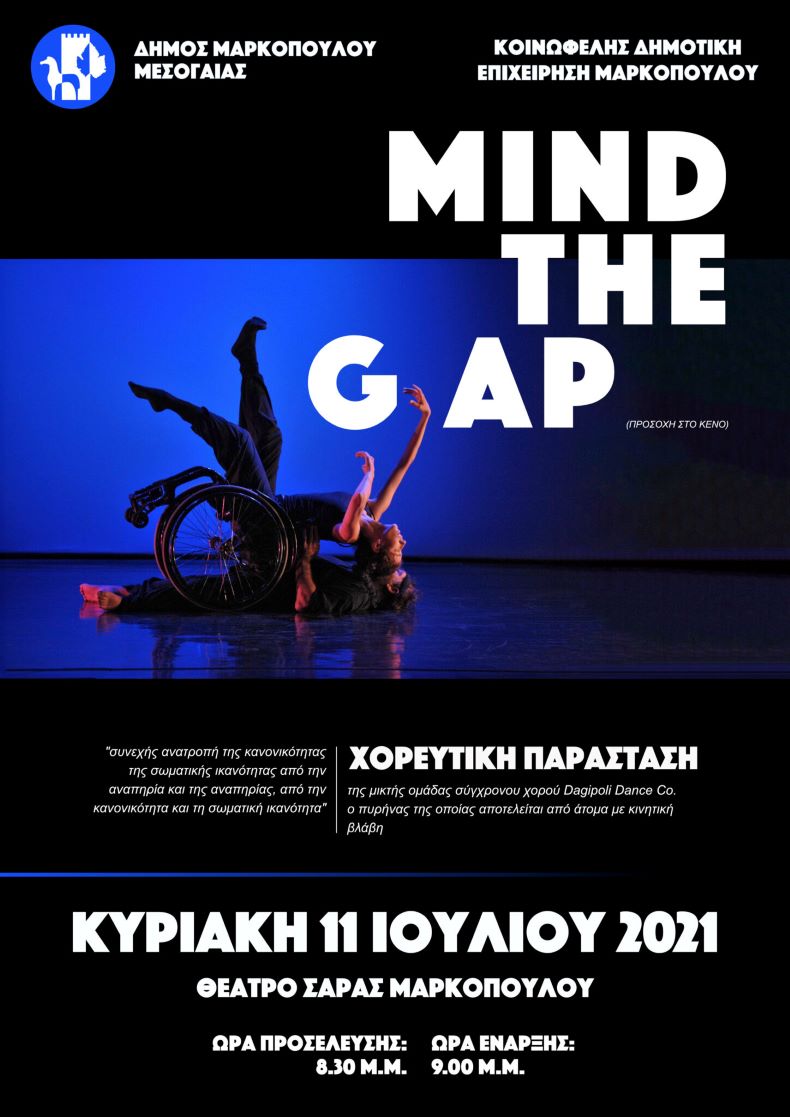 O Δήμος Μαρκοπούλου και η Κοινωφελής Δημοτική Επιχείρηση Μαρκοπούλου (Κ.Δ.Ε.Μ.). διοργανώνουν και σας προσκαλούν στη χορευτική παράσταση «MIND THE GAP», την Κυριακή 11 Ιουλίου 2021 και ώρα 9.00 μ.μ., στο ανοιχτό θέατρο Σάρας Μαρκοπούλου.