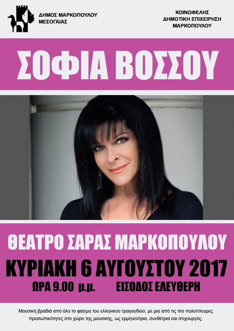 Κυριακή, 6 Αυγούστου και ώρα 9:00 το βράδυ, στο θέατρο Σάρας Μαρκοπούλου, μουσική βραδιά με την Σοφία Βόσσου, μία από τις πιο πολύπλευρες προσωπικότητες στο χώρο της μουσικής, ως ερμηνεύτρια, συνθέτρια και στιχουργός, αλλά και τηλεοπτική παραγωγός.