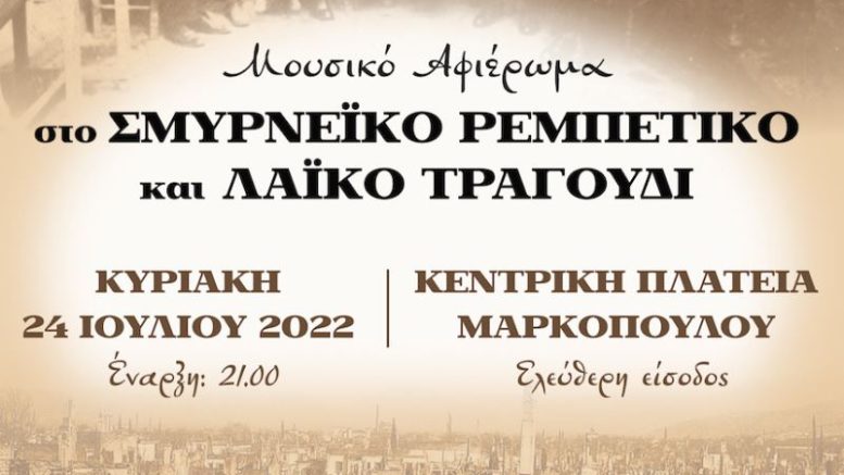 Ο Δήμος Μαρκοπούλου, η Κοινωφελής Δημοτική Επιχείρηση Μαρκοπούλου (Κ.Δ.Ε.Μ.) και η Περιφέρεια Αττικής, συνδιοργανώνουν και σας προσκαλούν σε ένα ζωντανό μουσικό αφιέρωμα στο Σμυρνέϊκο Ρεμπέτικο και Λαϊκό Τραγούδι, την Κυριακή 24 Ιουλίου 2022 και ώρα 21.00, στην Κεντρική Πλατεία Μαρκοπούλου.