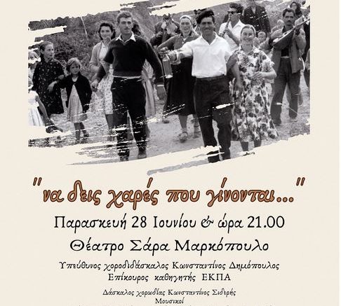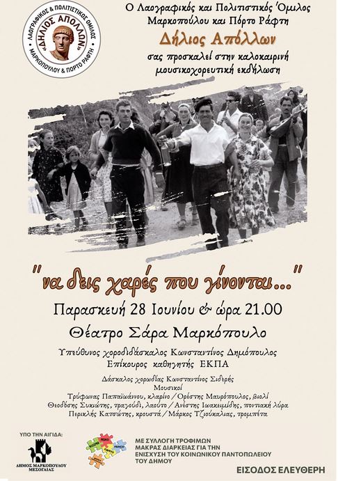 Ο Δήμος Μαρκοπούλου Μεσογαίας σας προσκαλεί την Παρασκευή 28 Ιουνίου 2024 και ώρα 21:00, στο Ανοιχτό Θέατρο Σάρα Μαρκοπούλου, στην ετήσια καλοκαιρινή παράσταση, με τίτλο «ΝΑ ΔΕΙΣ ΧΑΡΕΣ ΠΟΥ ΓΙΝΟΝΤΑΙ…», του Λαογραφικού και Πολιτιστικού Όμιλου Μαρκοπούλου και Πόρτο Ράφτη «Δήλιου Απόλλωνα».