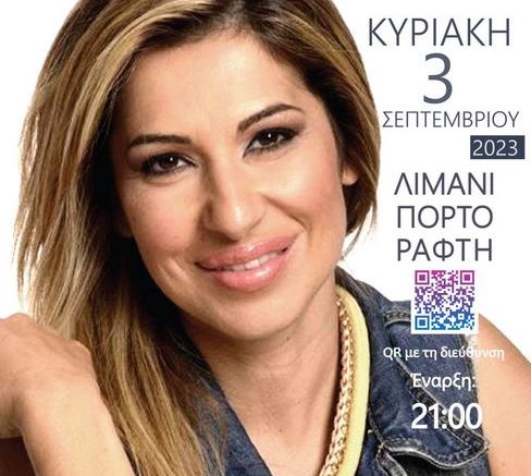 Ο Δήμος Μαρκοπούλου και η Κοινωφελής Δημοτική Επιχείρηση Μαρκοπούλου (Κ.Δ.Ε.Μ.), σας προσκαλούν την Κυριακή 3 Σεπτεμβρίου 2023 και ώρα 21.00 στο Λιμάνι Πόρτο Ράφτη, για να απολαύσουμε την αγαπημένη τραγουδίστρια Μαρία Νομικού.