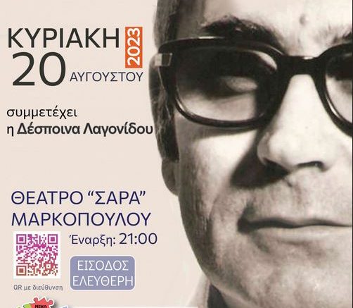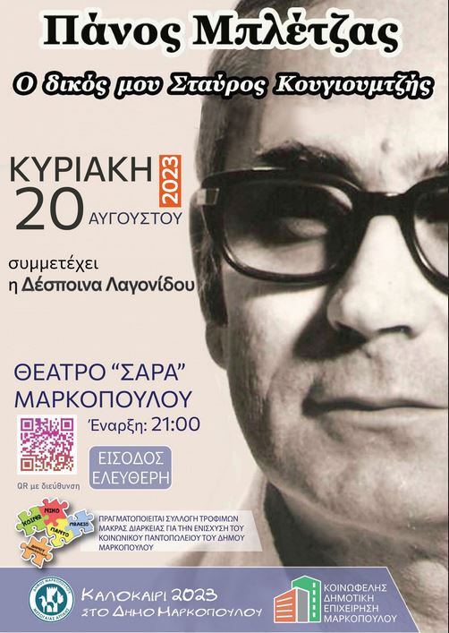 Ο Δήμος Μαρκοπούλου και η Κοινωφελής Δημοτική Επιχείρηση Μαρκοπούλου, σας προσκαλούν την Κυριακή 20 Αυγούστου 2023 και ώρα 21.00 στο ανοιχτό Θέατρο Σάρα Μαρκοπούλου, για να απολαύσουμε όλοι μαζί, το μουσικό αφιέρωμα στο έργο του σπουδαίου συνθέτη Σταύρου Κουγιουμτζή.