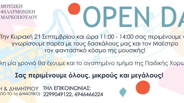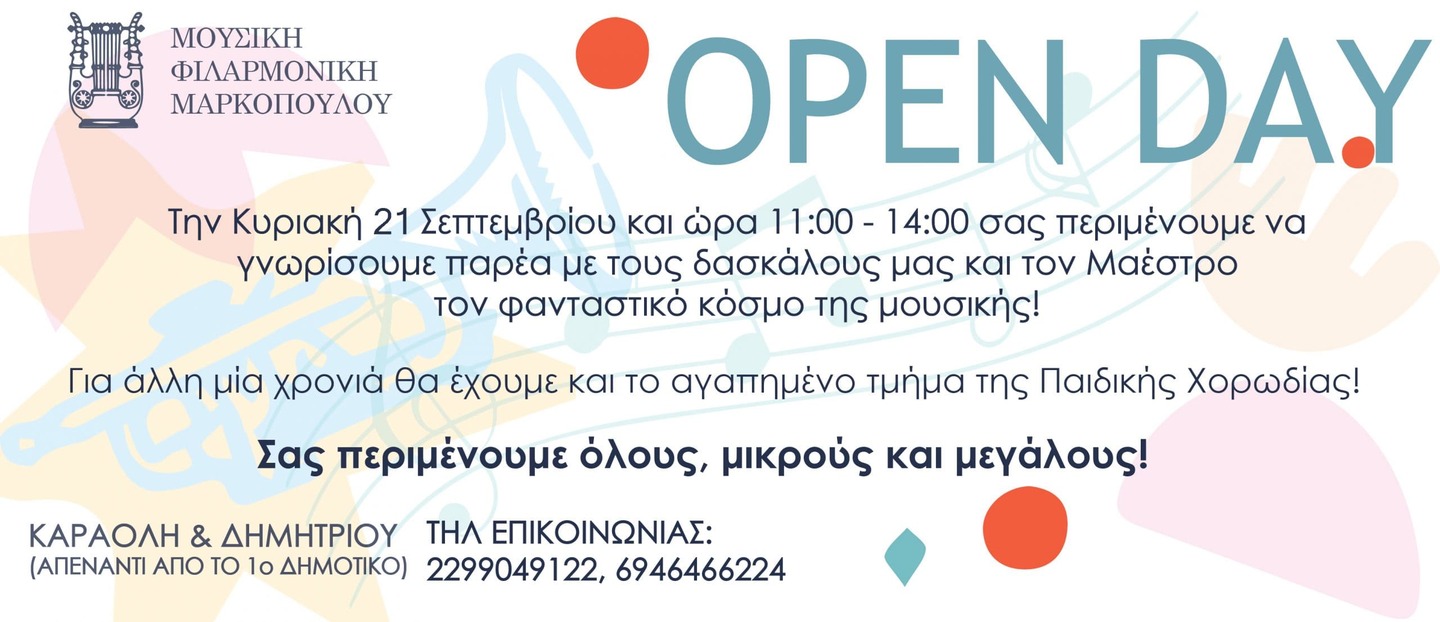 Ο Δήμος Μαρκοπούλου και ο σύλλογος «Μουσική Φιλαρμονική Μαρκοπούλου» σας καλούν την Κυριακή 21 Σεπτεμβρίου 2025 και ώρες 11:00 με 14:00, σε Open Day γνωριμίας με τους καθηγητές και τον Μαέστρο.