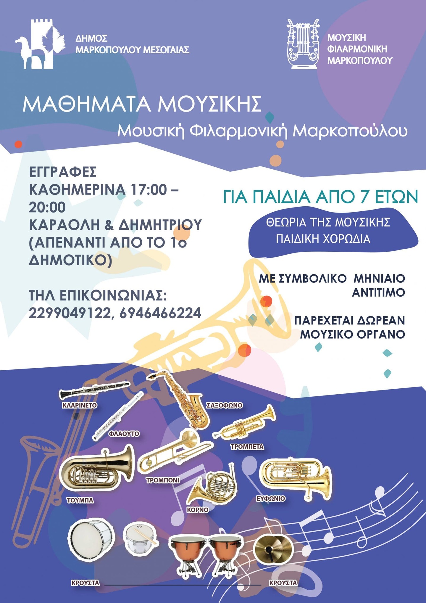 Οι εγγραφές για την παρακολούθηση μαθημάτων μουσικής πραγματοποιούνται καθημερινά 17:00 – 20:00 στο χώρο της Μ.Φ.Μ. στην οδό Καραολή και Δημητρίου (απέναντι από το 1ο Δημοτικό Σχολείο Μαρκοπούλου).