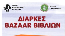 Tο ΚΑΠΗ Μαρκοπούλου σε συνεργασία με την Ομάδα Χειροτεχνίας & Δημιουργικής Απασχόλησης διοργανώνει διαρκές bazaar βιβλίων για την ενίσχυση της Ομάδας Χειροτεχνίας με αγορά υλικών…