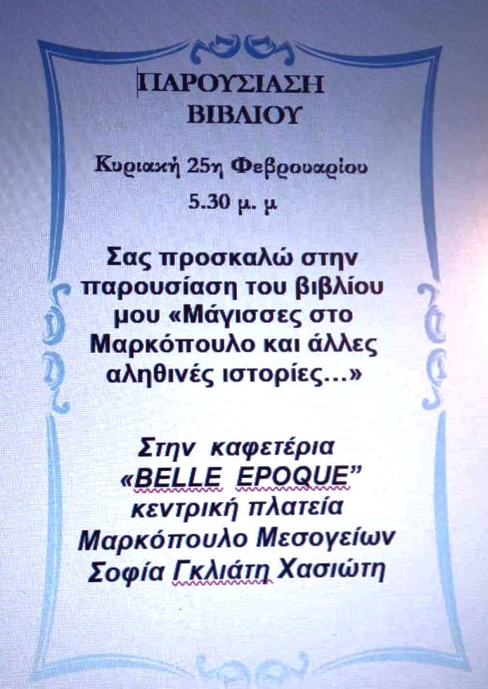 Παρουσίαση του βιβλίου «Μάγισσες στο Μαρκόπουλο και άλλες αληθινές ιστορίες από τα Μεσόγεια Αττικής», της Σοφίας Γκλιάτη – Χασιώτη