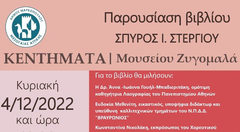 Ο Δήμος Μαρκοπούλου Μεσογαίας σας προσκαλεί στην παρουσίαση του βιβλίου του Δρ. Σπύρου Στεργίου, που θα πραγματοποιηθεί την Κυριακή 4 Δεκεμβρίου 2022 και ώρα 18.30 στο Πολιτιστικό Κέντρο του Δήμου Μαρκοπούλου (Γ. Παπαβασιλείου 34).