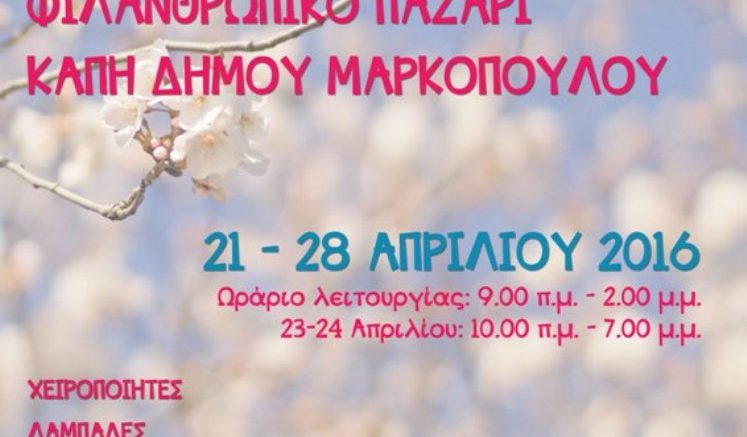 Ο Δήμος Μαρκοπούλου και το Ν.Π.Δ.Δ. «Βραυρώνιος» σας ενημερώνουν, ότι τα μέλη του ΚΑΠΗ Μαρκοπούλου, διοργανώνουν Πασχαλινό Φιλανθρωπικό Παζάρι, στο χώρο του ΚΑΠΗ (Κ. Γκλιάτη και Γ. Παπαβασιλείου, Μαρκόπουλο), από την Πέμπτη 21, έως και τη Μ. Πέμπτη 28 Απριλίου 2016.