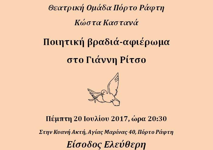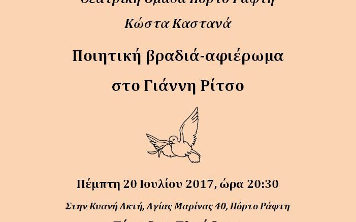 Ποιητική βραδιά-αφιέρωμα στον Γιάννη Ρίτσο την Πέμπτη 20 Ιουλίου 2017, ώρα 20:30 Στην Κυανή Ακτή, Αγίας Μαρίνας 40, Πόρτο Ράφτη από την Θεατρική Ομάδα Πόρτο Ράφτη Κώστα Καστανά