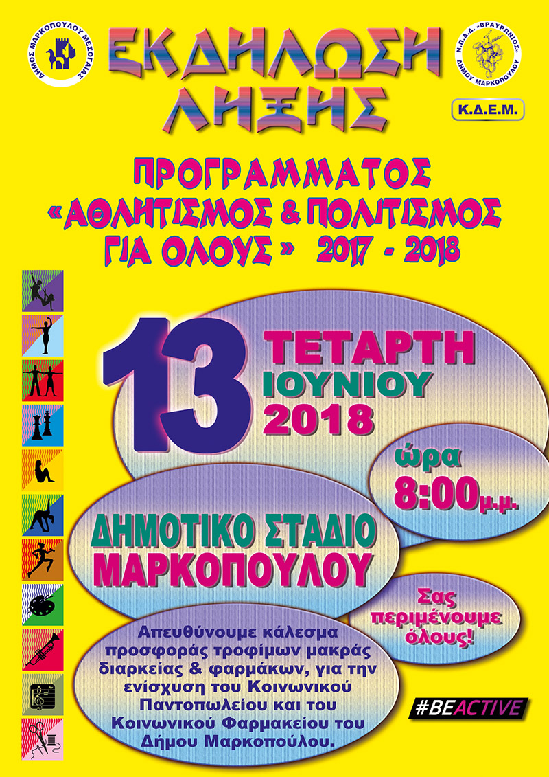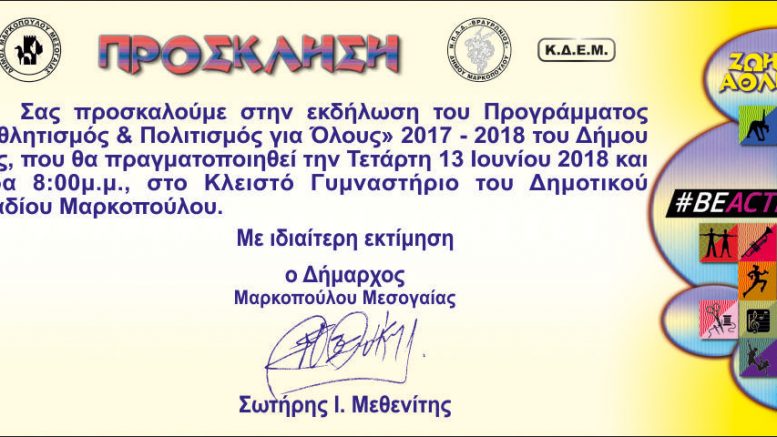 Ο Δήμος Μαρκοπούλου, το Ν.Π.Δ.Δ. «ΒΡΑΥΡΩΝΙΟΣ» και το Ν.Π.Ι.Δ. «ΚΔΕΜ», σας προσκαλούν και φέτος, με μεγάλη χαρά, στην Ετήσια Εκδήλωση του Προγράμματος «Αθλητισμός & Πολιτισμός για Όλους» 2017-2018.