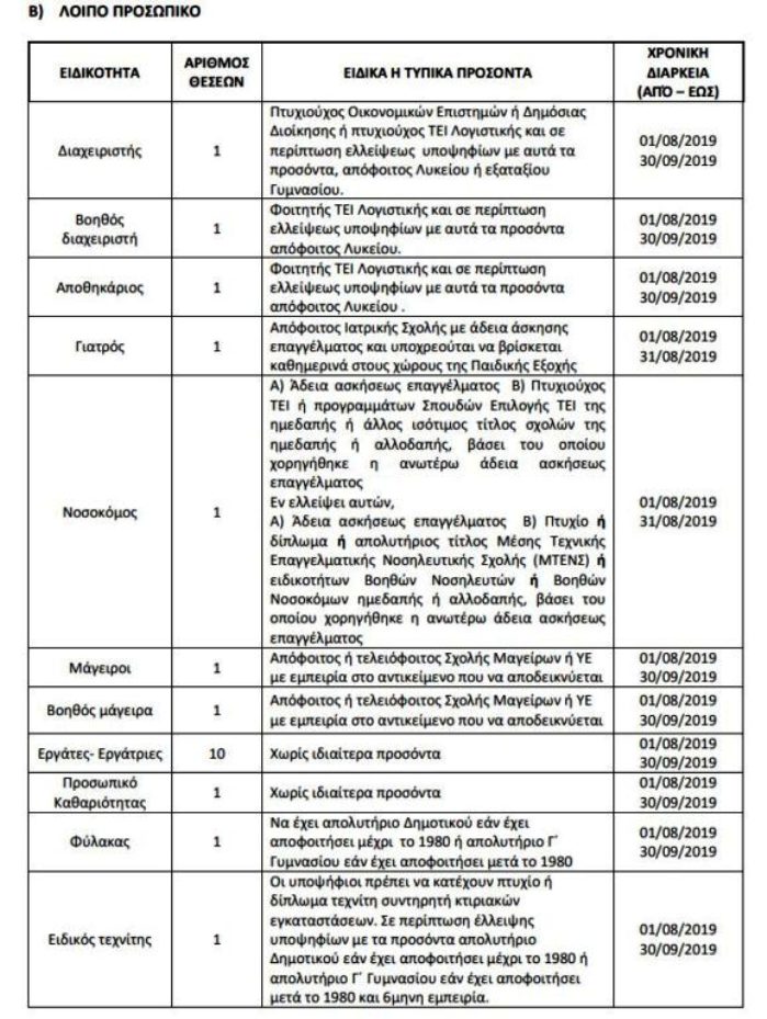 Πλήρωσης σαράντα οκτώ (48) θέσεων µε σύµβαση εργασίας ιδιωτικού δικαίου ορισµένου χρόνου στελεχών και λοιπού προσωπικού παιδικών κατασκηνώσεων του κρατικού προγράµµατος έτους 2019 που βρίσκονται στον Δήµο Λαυρεωτικής, στη Δηµοτική Ενότητα Κερατέας Αττικής (θέση Διόνυσος).