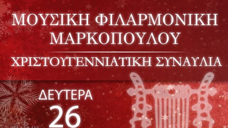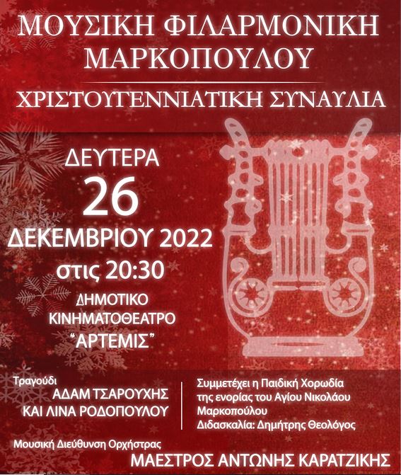 Ο Δήμος Μαρκοπούλου, η Κοινωφελής Δημοτική Επιχείρηση Μαρκοπούλου (Κ.Δ.Ε.Μ.) και η Μουσική Φιλαρμονική Μαρκοπούλου, σας προσκαλούν στην καθιερωμένη Χριστουγεννιάτικη Συναυλία στο Δημοτικό Κινηματοθέατρο Μαρκοπούλου «Άρτεμις», τη Δευτέρα 26 Δεκεμβρίου 2022 και ώρα 20.30.