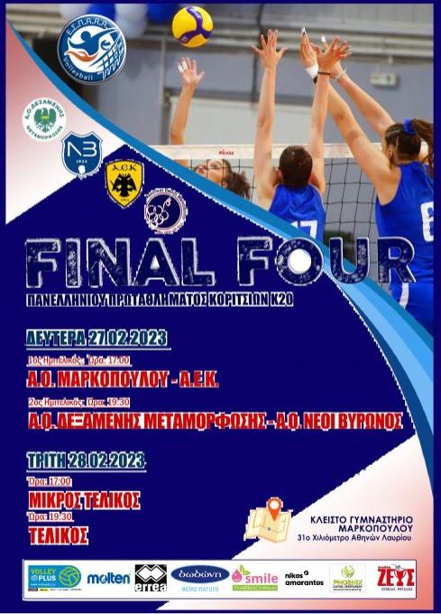 Στο Μαρκόπουλο θα διεξαχθεί το Final-4 του Πανελληνίου Πρωταθλήματος Κοριτσιών Κ20 της ΕΣΠΑΑΑ για το 2022-23, όπου οι Νεάνιδες του ΑΟ Μαρκοπούλου Revoil, θα διεκδικήσουν το τρόπαιο για 10η φορά στα τελευταία δέκα χρόνια, επιδιώκοντας να σπάσουν το δικό τους άπιαστο ρεκόρ, με εννέα κατακτήσεις, εκ των οποίων οι οκτώ συνεχόμενες (2015-2022)!