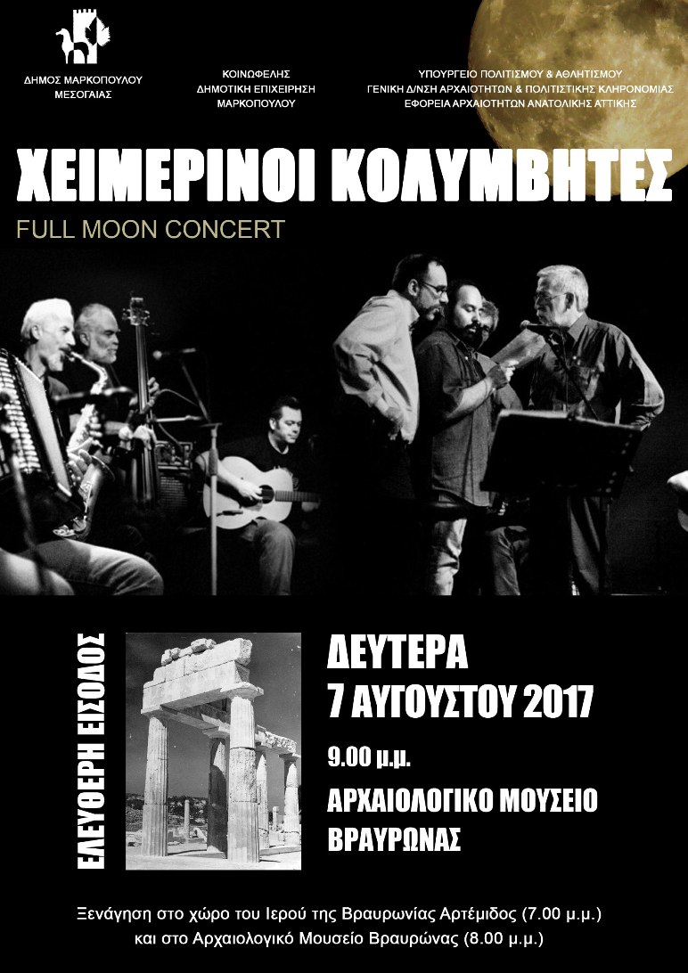 Δευτέρα 7 Αυγούστου 2017 και ώρα 9:00 το βράδυ στον Αρχαιολογικό Χώρο και το Μουσείο Βραυρώνας,συναυλία με τους «Χειμερινούς Κολυμβητές» σε μία μοναδική μουσική εμπειρία σε έναν χώρο απαράμιλλης φυσικής ομορφιάς και εξέχουσας αρχαιολογικής σημασίας στην Αυγουστιάτικη Πανσέληνο. Η εκδήλωση εντάσσεται στον εορτασμό της Αυγουστιάτικης Πανσελήνου που διοργανώνεται κάθε χρόνο από την Γενική Διεύθυνση Αρχαιοτήτων και Πολιτιστικής Κληρονομιάς του Υπουργείου Πολιτισμού και Αθλητισμού.