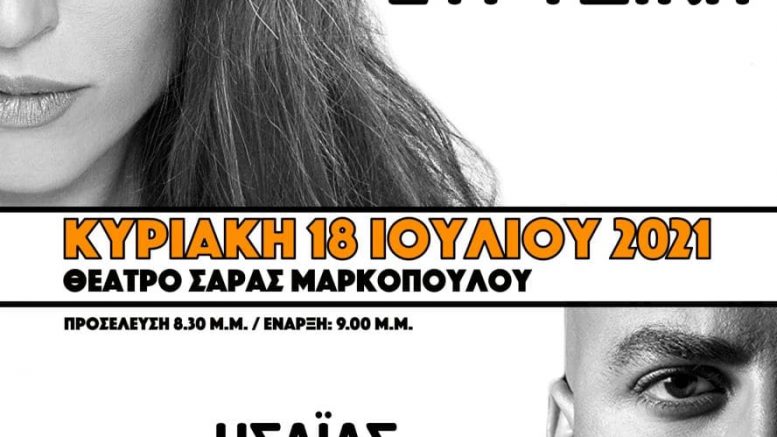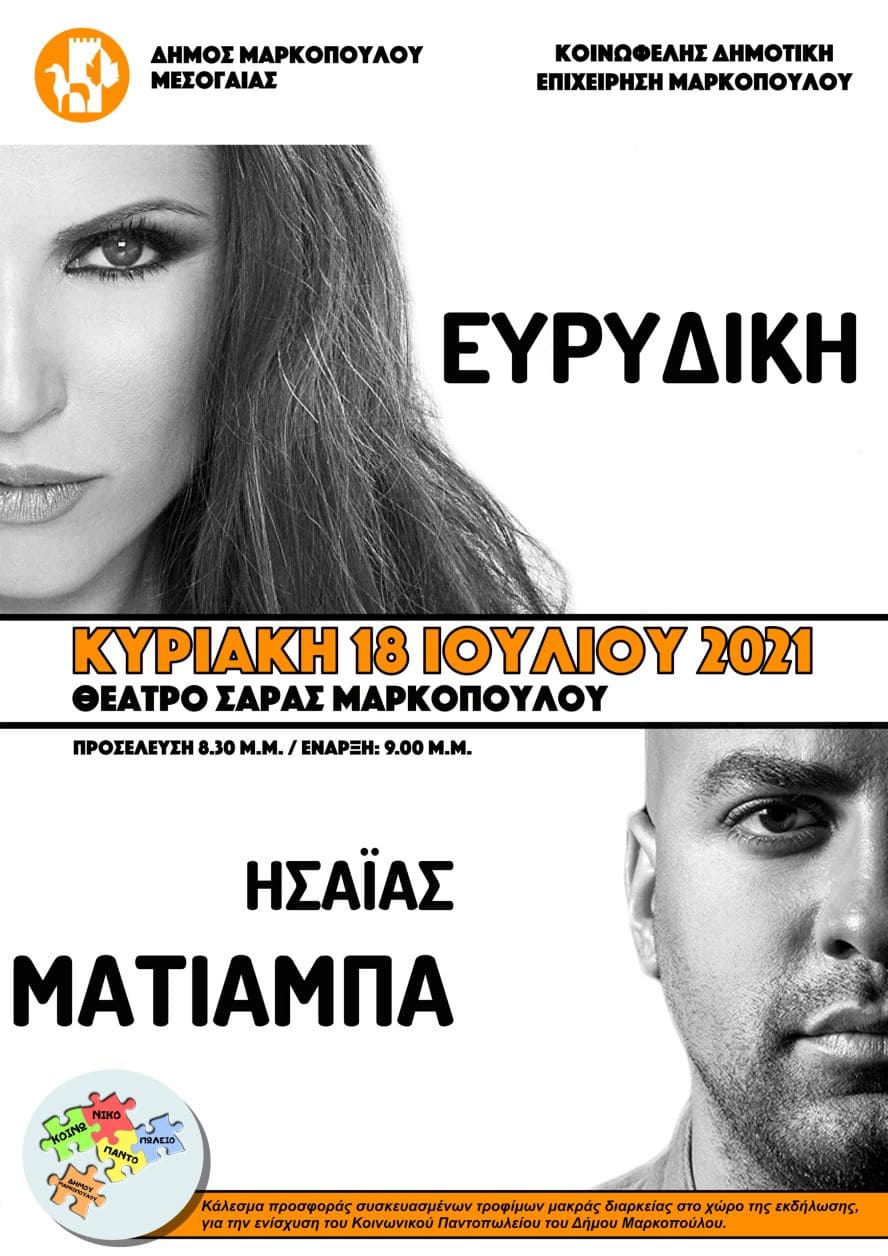 O Δήμος Μαρκοπούλου και η Κοινωφελής Δημοτική Επιχείρηση Μαρκοπούλου (Κ.Δ.Ε.Μ.) διοργανώνουν και σας προσκαλούν στη συναυλία με την Ευρυδίκη και τον Ησαΐα Ματιάμπα, την Κυριακή 18 Ιουλίου 2021 και ώρα 9.00 μ.μ., στο ανοιχτό θέατρο Σάρας Μαρκοπούλου.