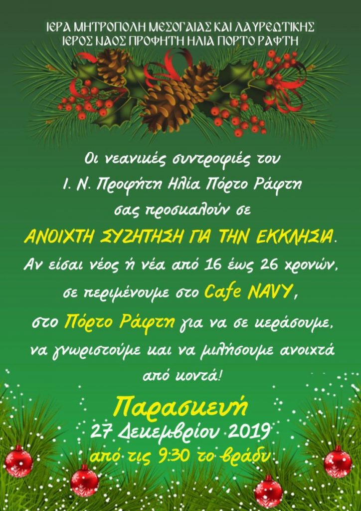 Be the first to comment on "Ανοιχτή Συζήτηση για την Εκκλησία από τις νεανικές συντροφιές του Ι. Ν. Προφήτη Ηλία Πόρτο Ράφτη"