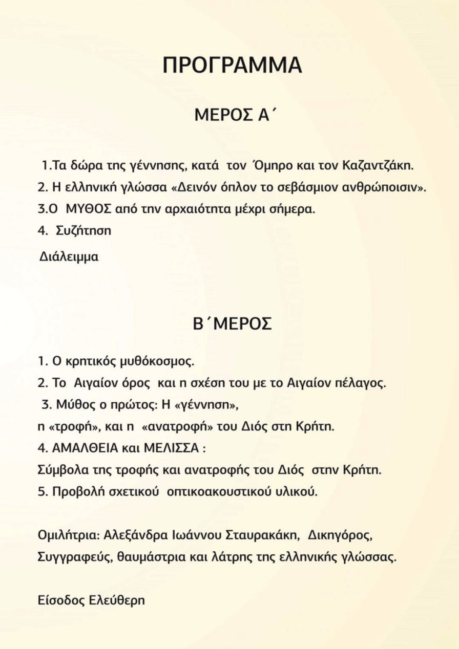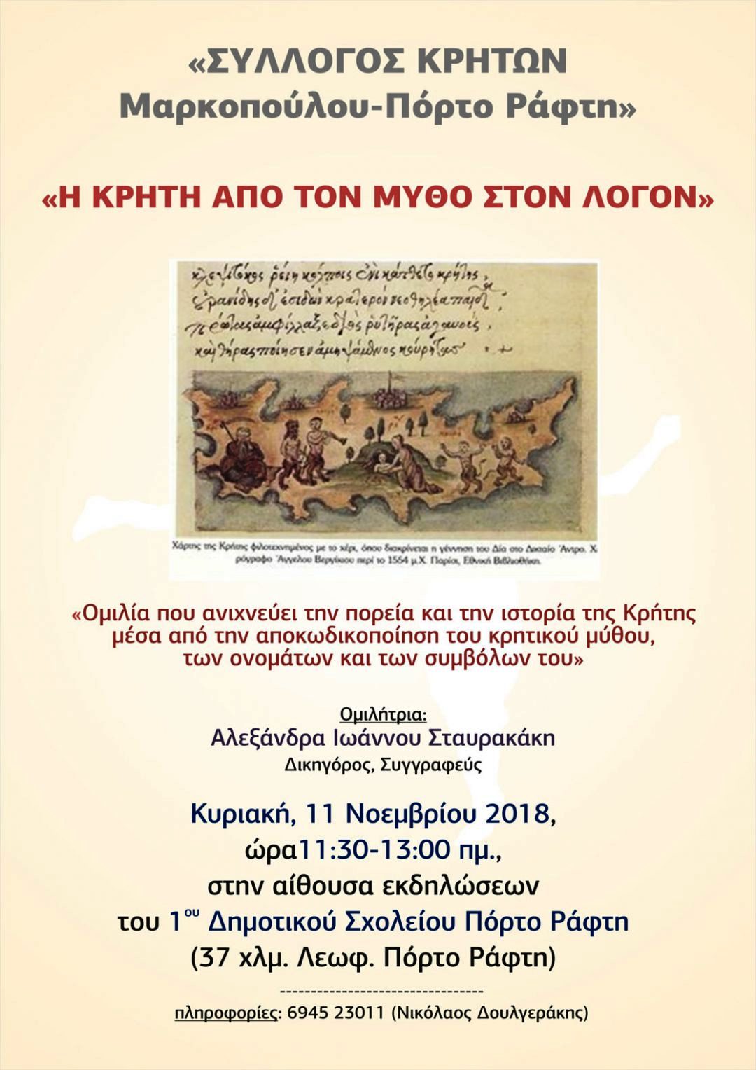 Be the first to comment on "ΣΥΛΛΟΓΟΣ ΚΡΗΤΩΝ Μαρκοπούλου – Πόρτο Ράφτη: “Η ΚΡΗΤΗ ΑΠΟ ΤΟΝ ΜΥΘΟ ΣΤΟΝ ΛΟΓΟΝ”"