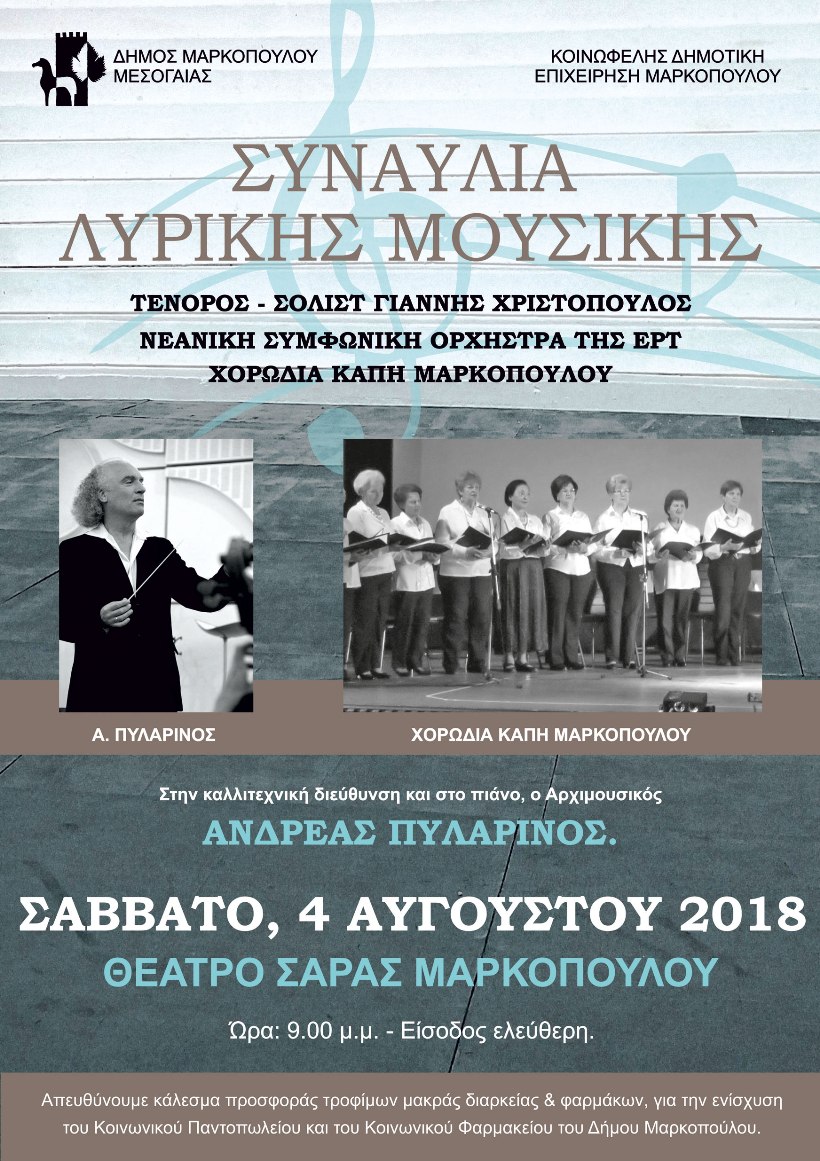 Ο Δήμος Μαρκοπούλου και η Κοινωφελής Δημοτική Επιχείρηση Μαρκοπούλου (Κ.Δ.Ε.Μ.), σας προσκαλούν το Σάββατο, 4 Αυγούστου 2018, στις 9 το βράδυ, σε Συναυλία Λυρικής Μουσικής, στο Θέατρο Σάρας Μαρκοπούλου.