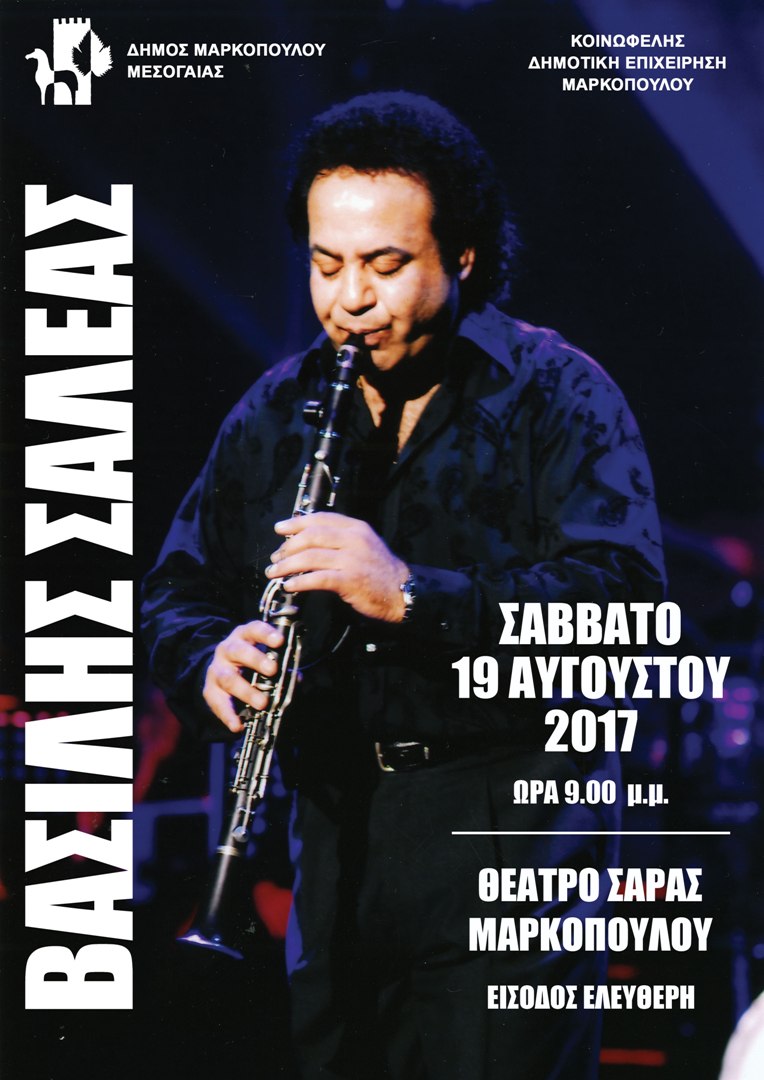 Ο Δήμος Μαρκοπούλου και η Κοινωφελής Δημοτική Επιχείρηση Μαρκοπούλου (Κ.Δ.Ε.Μ.), σας προσκαλούν στη Συναυλία, με τον κορυφαίο Έλληνα κλαρινίστα, Βασίλη Σαλέα και τον τραγουδιστή, Σαράντη Σαλέα, το Σάββατο, 19 Αυγούστου και ώρα 9:00 το βράδυ, στο θέατρο Σάρας Μαρκοπούλου.