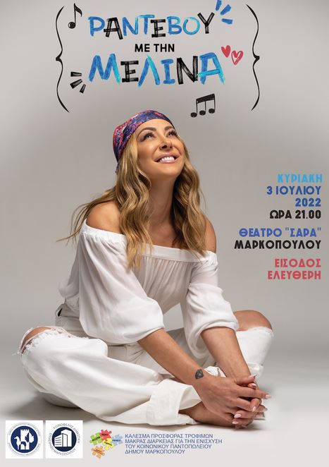 Ο Δήμος Μαρκοπούλου και η Κοινωφελής Δημοτική Επιχείρηση Μαρκοπούλου (Κ.Δ.Ε.Μ.) σας προσκαλούν σε ένα ξεχωριστό μουσικό «Ραντεβού με τη Μελίνα», την Κυριακή 3 Ιουλίου 2022 και ώρα 21.00 στο ανοιχτό θέατρο «Σάρα» Μαρκοπούλου.