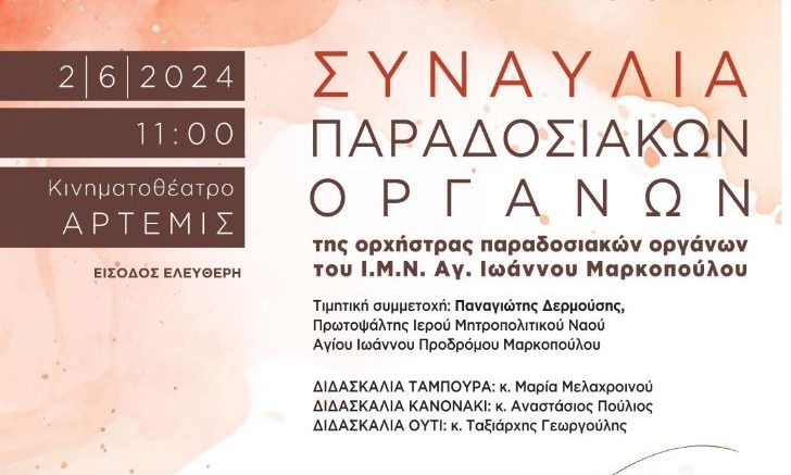 Συναυλία παραδοσιακών οργάνων της ορχήστρας παραδοσιακών οργάνων του Ι.Μ.Ν. Αγίου Ιωάννου Μαρκοπούλου 31 Μαΐου 2024