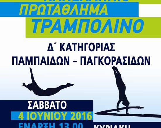 Τελική φάση Τραμπολίνο Συλλόγων και Ατομικού Δ’ κατηγορίας (παμπαίδων – παγκορασίδων Α’ και Β’) Α-Γ-Ε Περιφερειών, στο Κλειστό Γυμναστήριο του Δημοτικού Σταδίου Μαρκοπούλου.