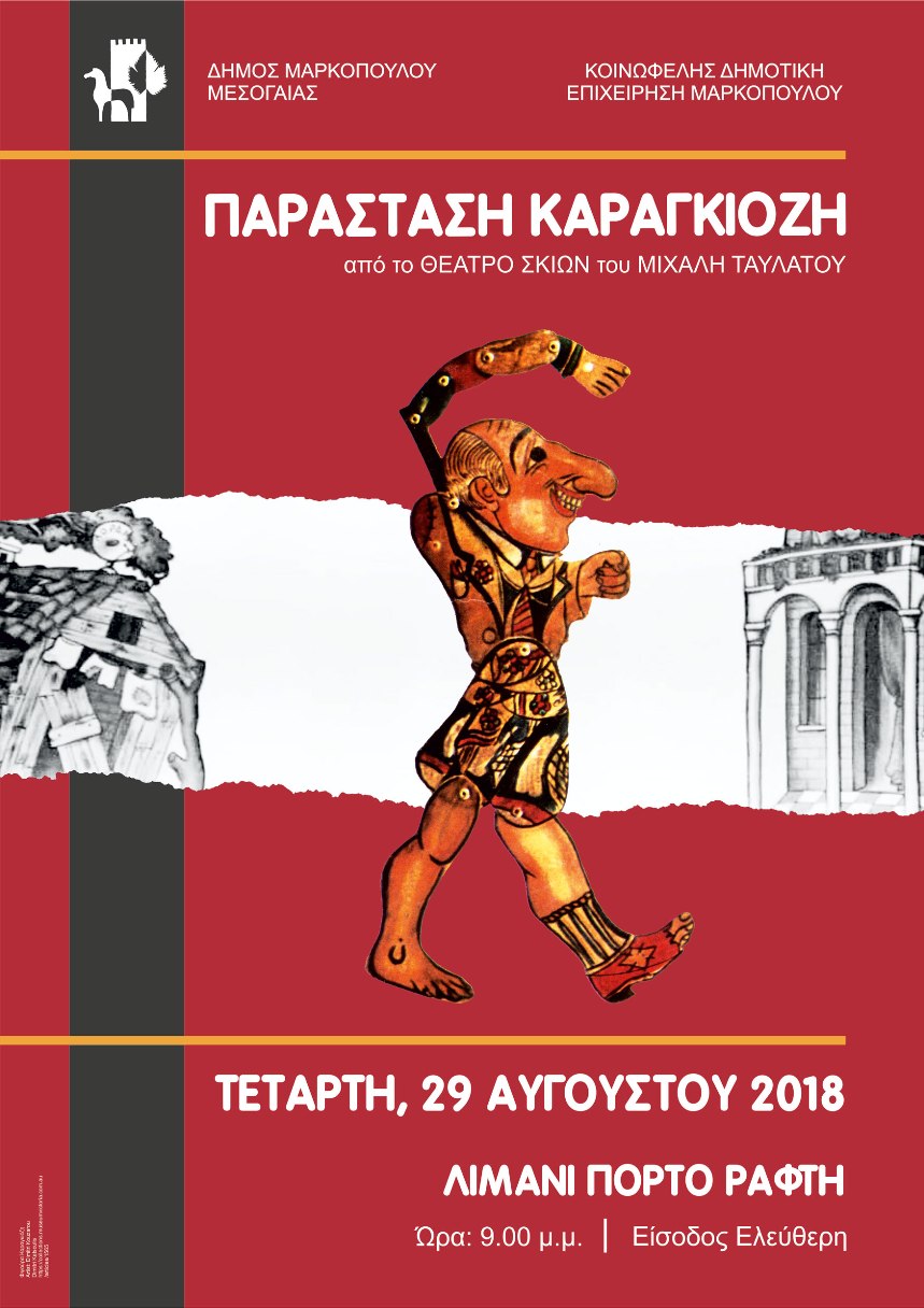 Ο Δήμος Μαρκοπούλου και η Κοινωφελής Δημοτική Επιχείρηση Μαρκοπούλου (Κ.Δ.Ε.Μ.), σας προσκαλούν την Τετάρτη, 29 Αυγούστου 2018 και ώρα 9:00 το βράδυ, να παρακολουθήσετε από κοντά τον αγαπημένο και διαχρονικό ήρωα μικρών και μεγάλων, ΚΑΡΑΓΚΙΟΖΗ, σε μία ξεχωριστή παράσταση, που επιμελήθηκε και θα παρουσιάσει το «Ελληνικό Λαϊκό Θέατρο Σκιών Μιχάλη Ταυλάτου», στο Λιμάνι Πόρτο Ράφτη.