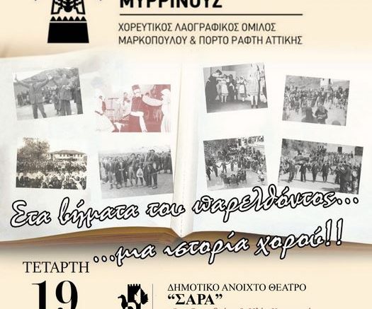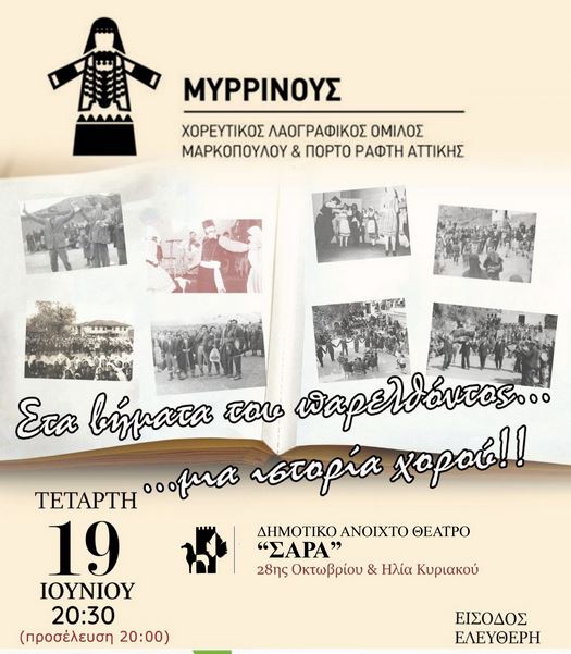 Ο Δήμος Μαρκοπούλου Μεσογαίας σας προσκαλεί την Τετάρτη 19 Ιουνίου 2024 και ώρα 20:30, στο Ανοιχτό Θέατρο Σάρα Μαρκοπούλου, στην ετήσια καλοκαιρινή παράσταση, με τίτλο «Στα βήματα του παρελθόντος… μια ιστορία χορού!», του Χορευτικού Λαογραφικού Ομίλου Μαρκοπούλου & Πόρτο Ράφτη Αττικής «Μυρρινούς».