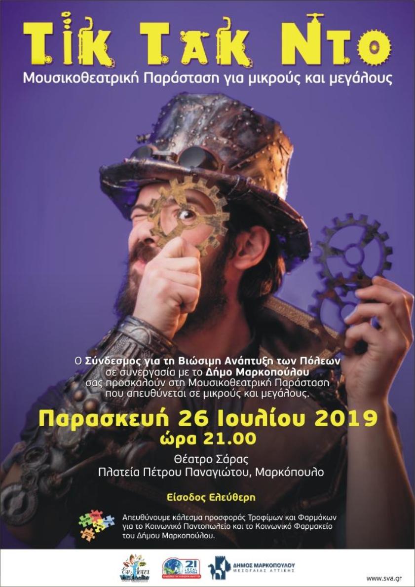 Συνεχίζοντας τις πολύ επιτυχημένες συνεργασίες με τους Δήμους-Μέλη του στον τομέα των Πολιτιστικών, ο Σύνδεσμος για τη Βιώσιμη Ανάπτυξη των Πόλεων σε συνεργασία με τον Δήμο Μαρκοπούλου και την ομάδα PlaRou παρουσιάζει τη Μουσικοθεατρική Παράσταση «Τικ Τακ Ντο» που απευθύνεται σε μικρούς και μεγάλους.