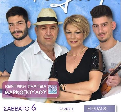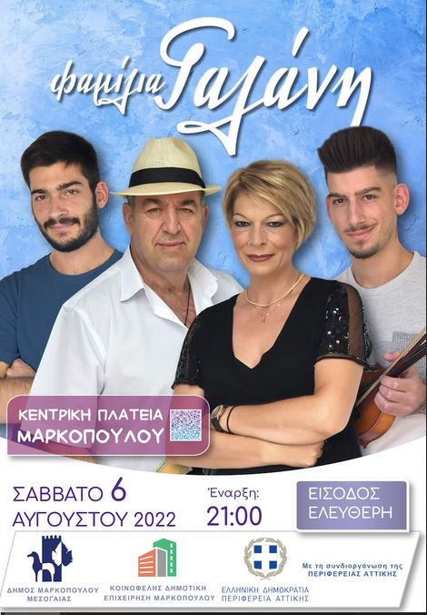 Ο Δήμος Μαρκοπούλου, η Κοινωφελής Δημοτική Επιχείρηση Μαρκοπούλου (Κ.Δ.Ε.Μ.) και η Περιφέρεια Αττικής, συνδιοργανώνουν και σας προσκαλούν στη μουσική εκδήλωση με τη «Φαμίλια Γαλάνη», το Σάββατο 6 Αυγούστου 2022 και ώρα 21.00 στην κεντρική πλατεία Μαρκοπούλου.