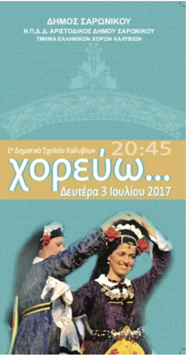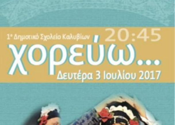 “ΧΟΡΕΥΩ…” Χορευτική Παράσταση από το Τμήμα Ελληνικών Χορών Καλυβίων του Ν.Π.Δ.Δ. “ΑΡΙΣΤΟΔΙΚΟΣ” του Δήμου Σαρωνικού, τη Δευτέρα 3 Ιουλίου στις 20:45 στο 1ο Δημοτικό Σχολείο Καλυβίων.
