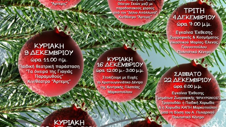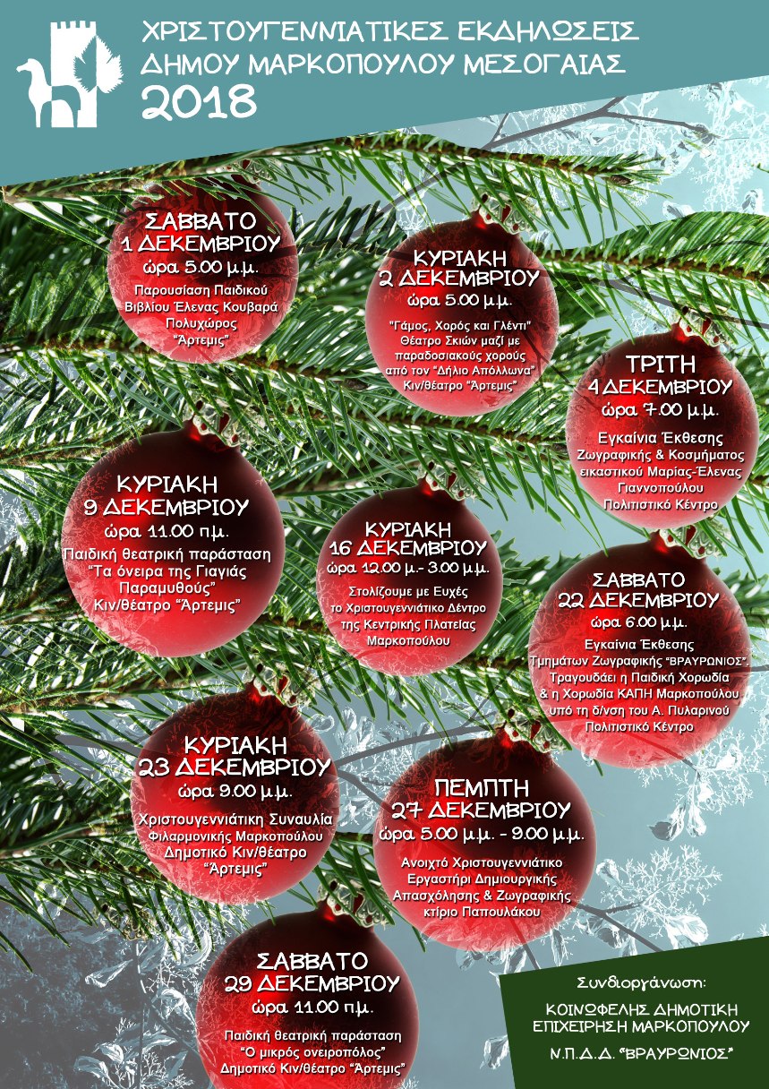 Ο Δήμος Μαρκοπούλου, η Κοινωφελής Δημοτική Επιχείρηση Μαρκοπούλου και το Ν.Π.Δ.Δ. «ΒΡΑΥΡΩΝΙΟΣ», σας καλούν να νιώσετε το εορταστικό κλίμα των ημερών και σας προσκαλούν να συμμετάσχετε όλοι και όλες, στις Χριστουγεννιάτικες Εκδηλώσεις 2018, στην πόλη μας!