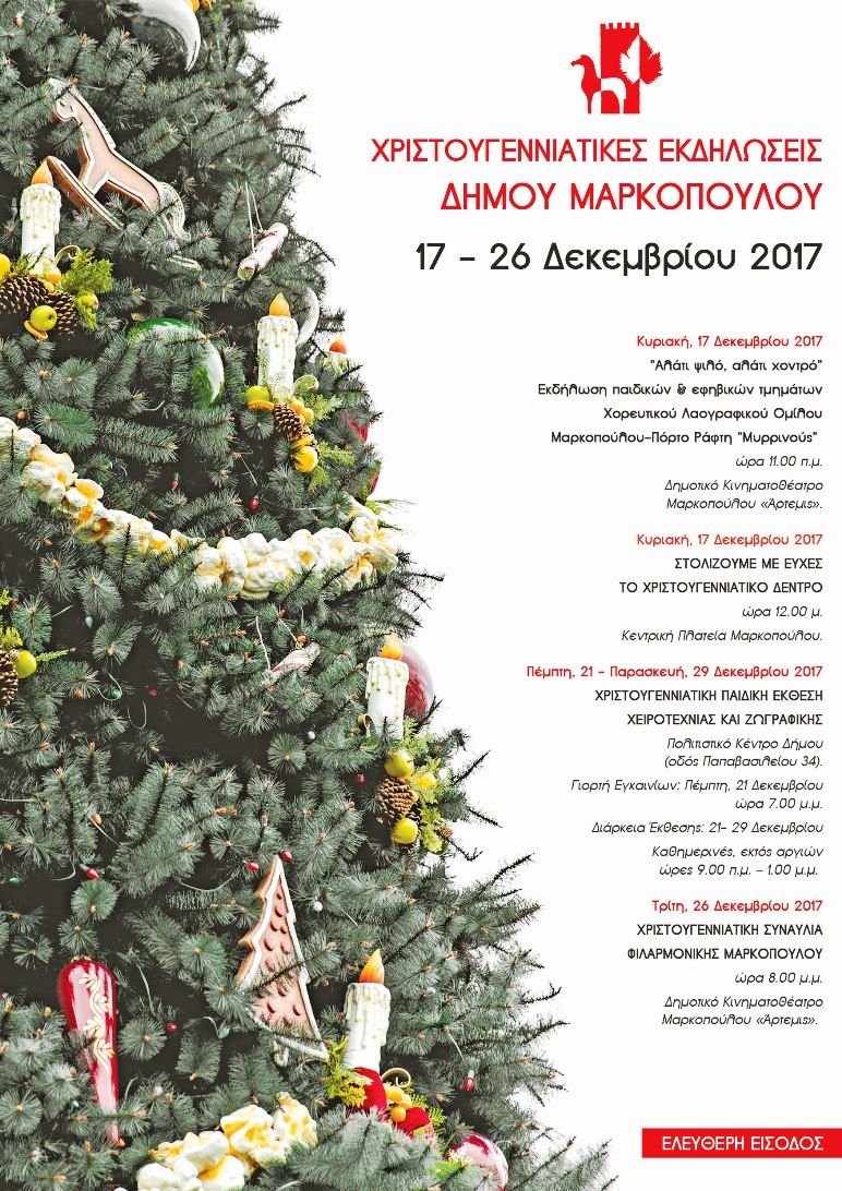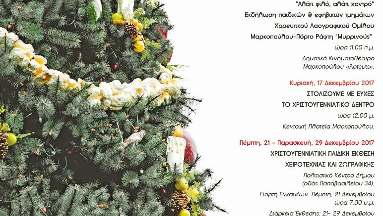 Ο Δήμος Μαρκοπούλου, στο πνεύμα των εορταστικών ημερών, διοργανώνει και σας προσκαλεί, σε μία σειρά Χριστουγεννιάτικων Εκδηλώσεων, για μικρούς και μεγάλους, με ελεύθερη είσοδο!