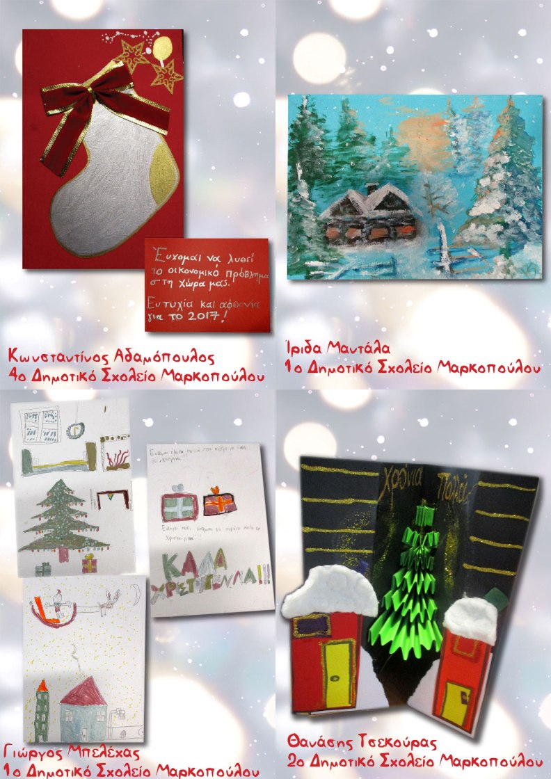 Θερμά συγχαρητήρια αξίζουν και στους έξι (6) δημιουργούς των καρτών, που θα μετατραπούν σε μεγάλες αφίσες και θα στολίζουν το Δημαρχείο Μαρκοπούλου, για όλη την περίοδο των εορτών: