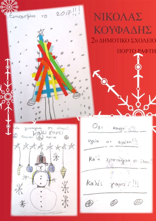 Η γεμάτη χρώμα και αισιοδοξία, χριστουγεννιάτικη κάρτα που επιμελήθηκε ο Νικόλαος Κουφάδης, της Δ’ τάξης, του Β’ Δημοτικού Σχολείου Πόρτο Ράφτη, εντυπωσίασε τον Δήμαρχο και αποτελεί πλέον την επίσημη ευχητήρια κάρτα του, για τις φετινές εορτές. Ο δημιουργός της κάρτας, θα έχει ως έπαθλο, για εκείνον και την οικογένειά του, ελεύθερη είσοδο στο Δημοτικό Κινηματοθέατρο «Άρτεμις», για την χειμερινή σεζόν 2016-2017!